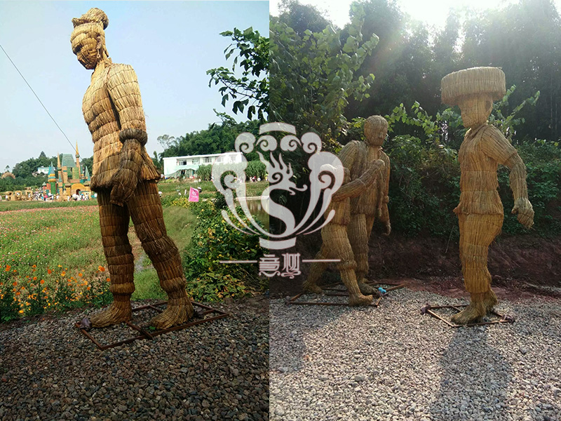 現在的精致稻草人藝術通常是由專業美術老師的造型放樣,然后由焊工師傅焊接出立體造型造型,然后以稻草或者稻草繩為材料編捆制作而成。