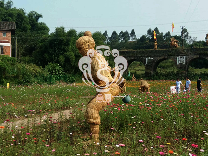 現(xiàn)在的精致稻草人藝術(shù)通常是由專業(yè)美術(shù)老師的造型放樣,然后由焊工師傅焊接出立體造型造型,然后以稻草或者稻草繩為材料編捆制作而成。