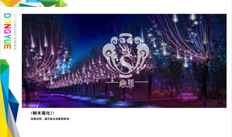 本次設計方案形式新穎、亮點突出、格調高雅,與“迎春、禮佛”的主題環環相扣,喜慶的節日氛圍在這交相輝映的盛世燈組中得到體現,讓整個東岳寺充滿著舞動心弦的魅力。透過本次高品位氛圍體會到時代發展為人們帶來了更新、更加美好的幸福生活。