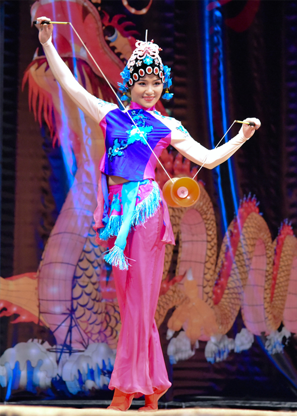 一個表演銅鼓空竹的演繹家